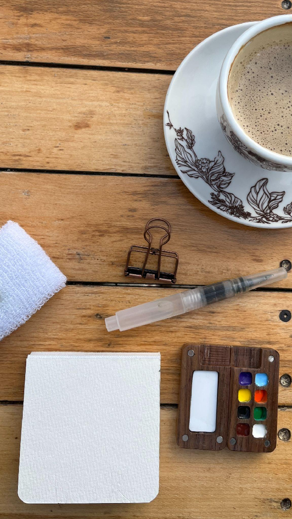 • Paint (watercolor pans or a small portable set) * Brush (a water brush is the easiest option for beginners) * Paper (watercolor paper or a small sketchbook) * Something to mix on (a built-in palette or lid works great) * Optional: a small tissue or cloth for dabbing excess water