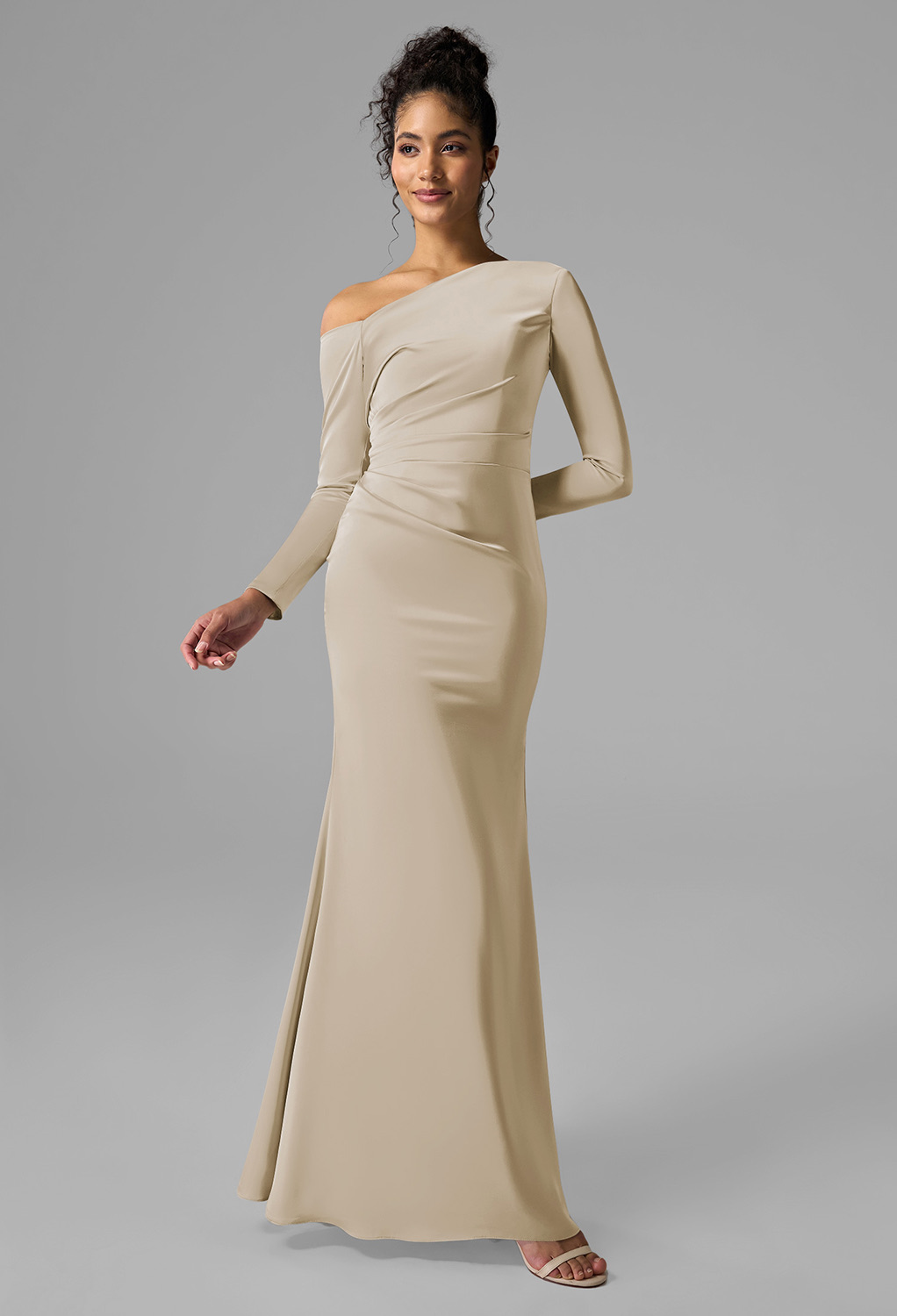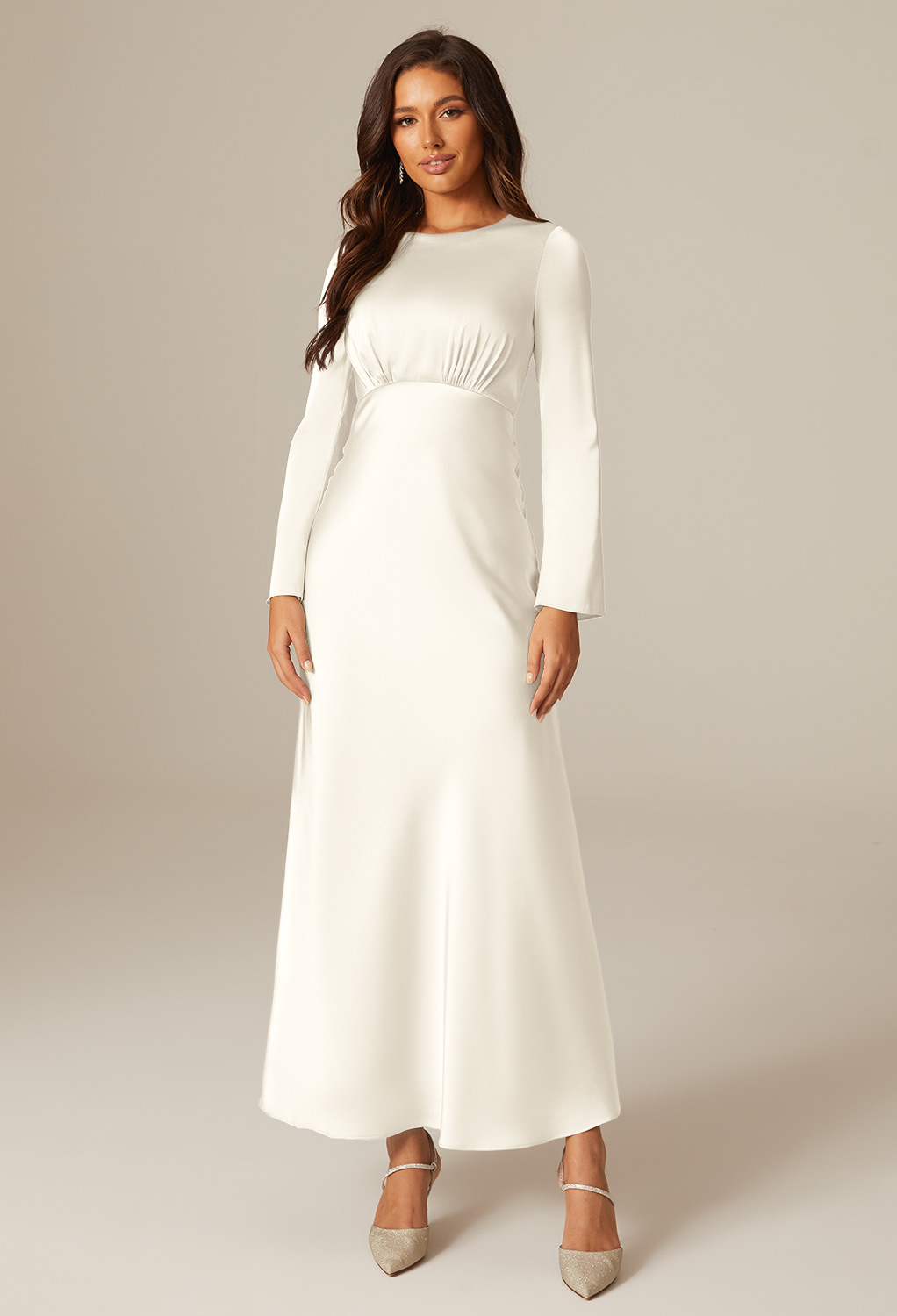 For those embracing the winter wedding as a chance to channel a snow queen aesthetic, the AW Ginevra Ivory Dress is the epitome of icy elegance. Crystal satin charmeuse drapes beautifully over the body, catching light to produce a soft, luminescent glow that evokes frosted mornings and sparkling icicles. The bateau neckline provides a sophisticated frame for statement earrings or a delicate necklace, while the long sleeves offer practical warmth without sacrificing style. An ankle-length hem ensures mobility, whether you’re posing for group photos outside or navigating a dance floor with freshly polished shoes. Add icy blue heels, pearl accents, or even a faux fur stole for a regal winter-ready finish. This dress is made for guests who want to be remembered long after the last toast.