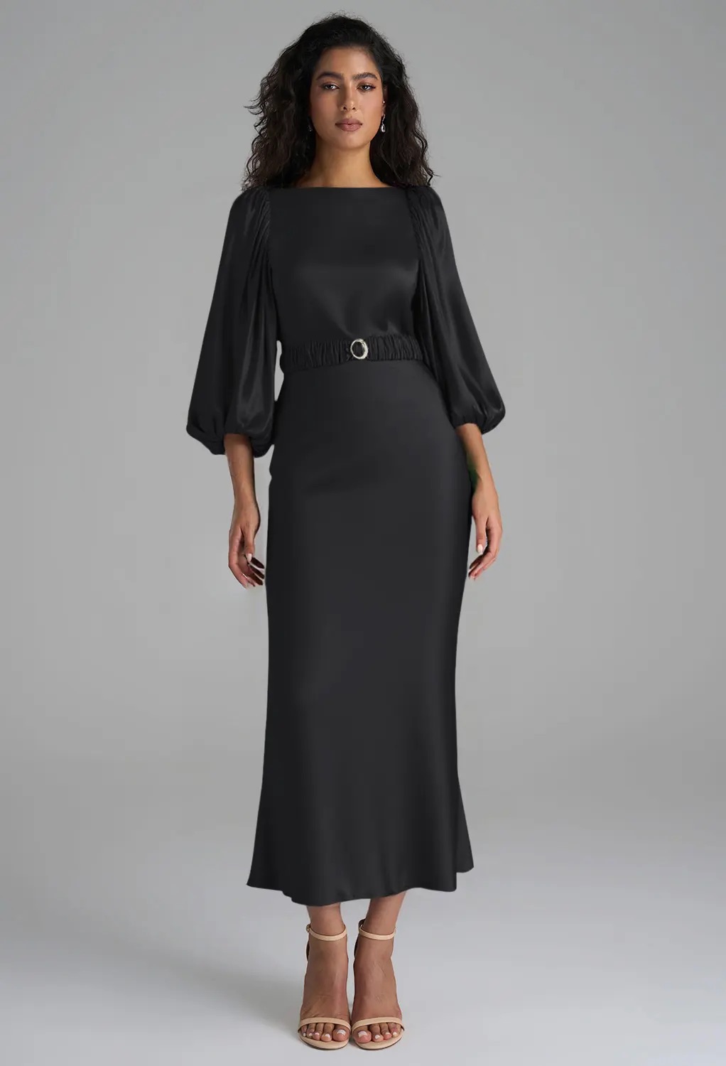 Who says winter weddings have to be all about soft neutrals? The AW Vida Black Metallic Dress brings a sultry, glamorous edge to the season. Its shimmering satin charmeuse hugs curves with effortless elegance, while the mermaid silhouette and high fitted waist provide structure and sophistication. The midi length is ideal for dancing — showing just enough leg while allowing easy movement across slippery winter floors. Perfectly paired with black stilettos, a bold red lip, and minimal silver accessories, this dress ensures you’ll be the guest everyone remembers, especially during candlelit receptions or evening ceremonies where metallics catch the soft glow beautifully.