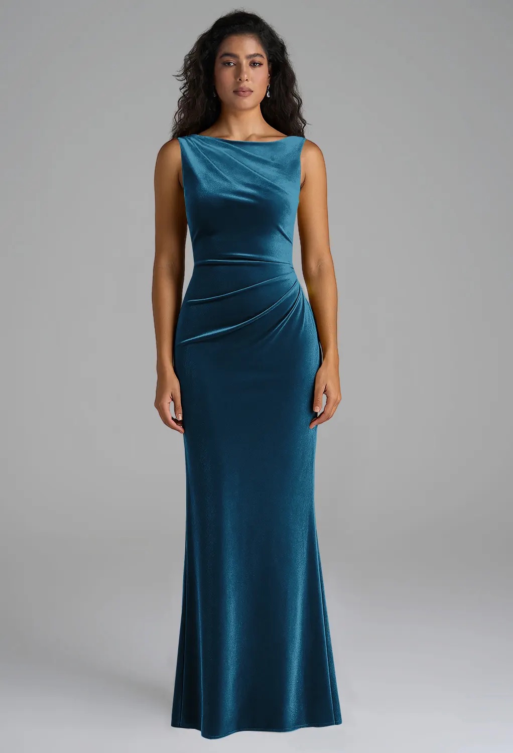 The AW Radmila Midnight Navy Dress is a tribute to classic winter sophistication. Its rich velvet fabric drapes gracefully, and the mermaid silhouette accentuates curves elegantly. The bateau neckline provides a perfect stage for statement earrings or a layered necklace, while the floor-length hemline ensures a formal, polished look. Pair this gown with silver accessories and a classic red lip for a timeless ensemble that will turn heads from ceremony to reception. Imagine moving gracefully across the dance floor, the velvet catching candlelight and creating subtle, mesmerizing shimmer.
