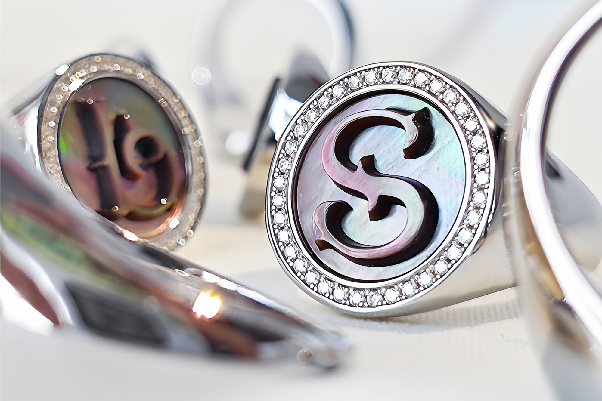 Initial rings have always been loved because they feel unmistakably personal, like something made just for you. Brilliant Carats uses natural black mother-of-pearl for the signet face, which shows soft flashes of blue, green, purple, and gold when it catches the light. The subtle shift in color gives the ring a refined, almost “lucky” feel that many women love.